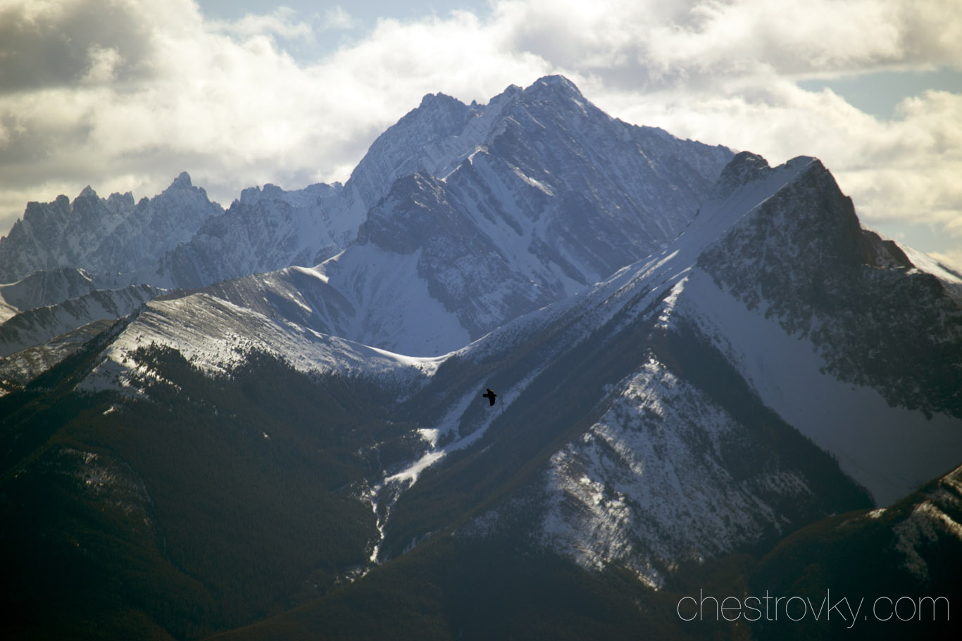 Nejzajímavější výhled však nabízí západní a jižní strana. Celý hřeben začíná již zmiňovaným vrcholem Ha Ling, který je jen pár metrů vyšší než Pigeon, pokračuje přes nádherné Tři Sestry, dominujícím masivem Mount Lougheed (3.105m) a končí špičatou Wind Mountain. Na vrcholu Pigeon Mountain jsem si sedl do závětří a poobědval. Restauraci s takovým výhledem by si málokdo mohl dovolit, ale pokud to stojí jen usilí ve vlastních nohách, oběd zcela jistě chutná lépe než v kdejakém nóbl podniku.